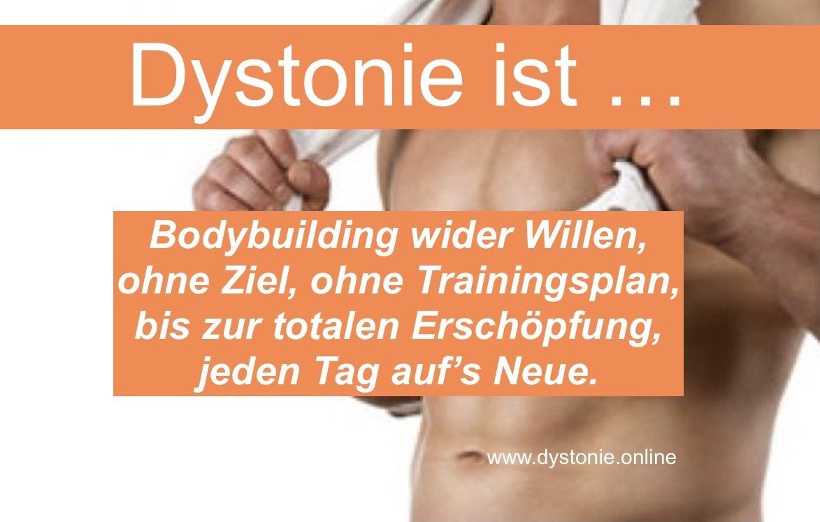 Dystonie ist höchstüberwiegend eine hirnorganisch- "hyperkinetische Bewegungsstörung". Sie geht vom Grunde her mit einem Zuviel an Bewegung einher, die unwillentlich erfolgt und nicht "mal eben so" unterdrückt werden kann.