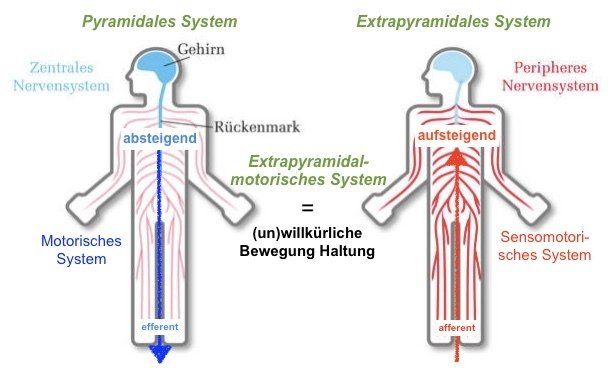 - anderseits von den peripheren Nerven aufsteigend (afferent extrapyramidal) über die Muskeln in die Basalganglien (Sensomotorische System) gesendet.