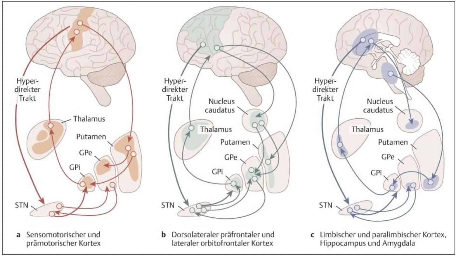 - Ohne Beteiligung des Peripheren Nervensystems: Basalganglien > Thalamus > (Motor)Kortex und zurück