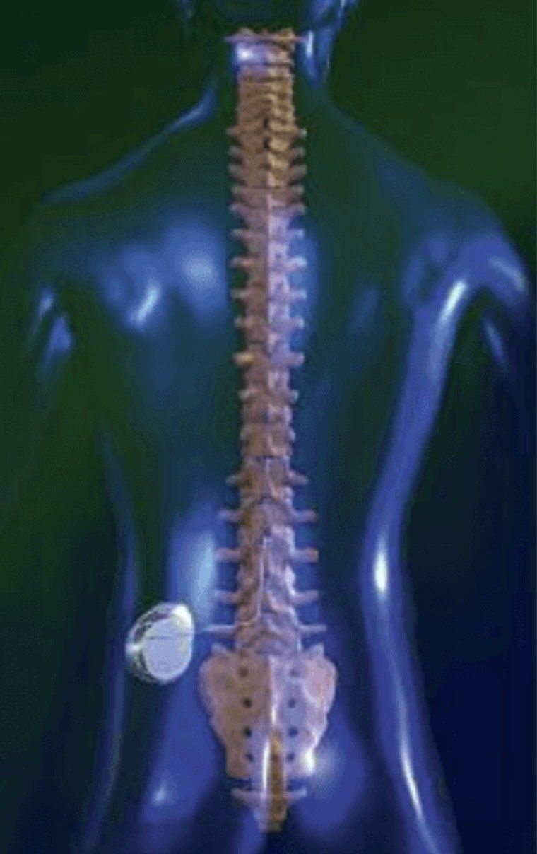 In einem nächsten Schritt wird die vorab mit Baclofen gefüllte Medikamentenpumpe zwischen Bauchmuskeln und Fettschicht unter der Haut eingebracht und mit einem Schlauch verbunden. Dieser wird sodann vermittels eines "Messerrohrs" um die Flanke herum entlang der Wirbelsäule zum Katheter hinaufgezogen und dort mit dem Selbigen verbunden.