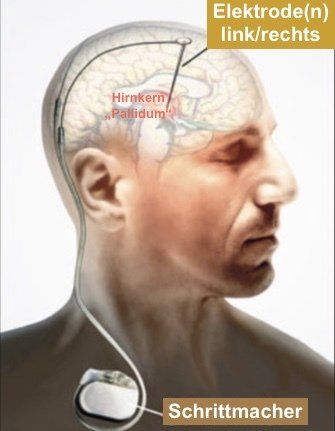 Bei der Tiefen Hirnstimulation (kurz THS) handelt es ich um einen neurochirurgischen Eingriff am Gehirn, bei dem bei Dystoniebetroffenen Elektroden in das Tiefe Hirn - genau genommen in die motorische Zentralschaltstelle, also die Basalganglien - implantiert bekommen. Bei Dystonie werden diese regelmäßig in der linken wie rechten Hirnhälfte im "internen Palladium", einem jeweils winzigen Areal in den Basalganglien, platziert und über Kabel mit dem Impulsgeber (Schrittmacher) verbunden.