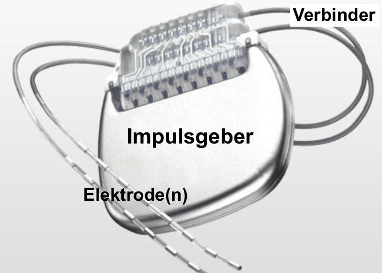 Medizintechnisch besteht eine Tiefe Hirnstimulation aus drei wesentlichen Komponenten: Wenigstens zwei Elektroden, zwei Kabelverbindungen und ein Impulsgeber.