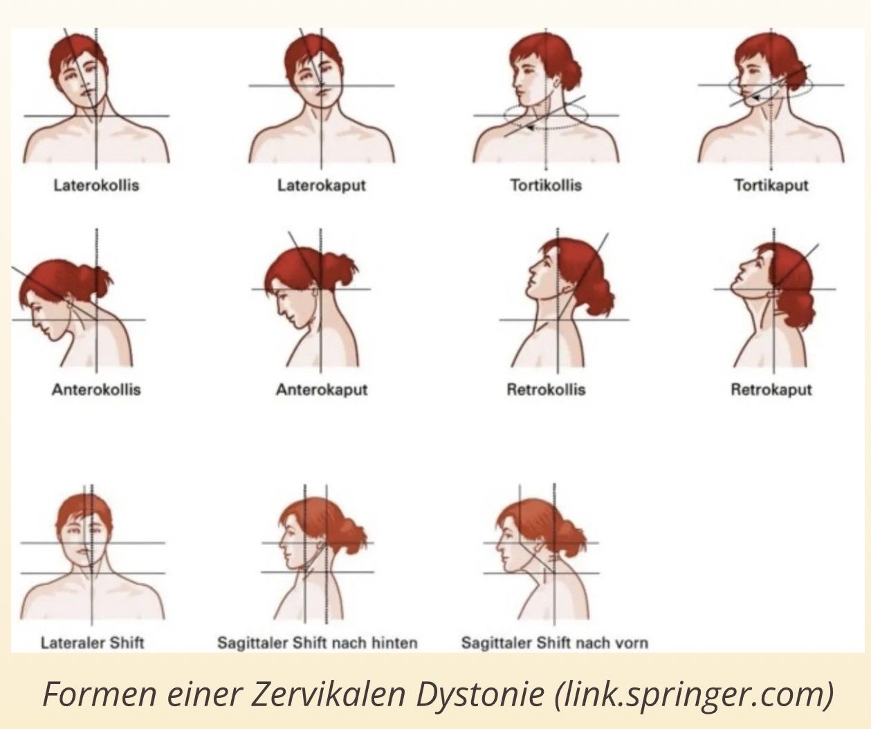 dystone Erscheinungsform dar (vgl. u.a. Reichel, Gerhard: Zervikale Dystonien. In "Der Neurologe und Psychiater", DNP 2016).