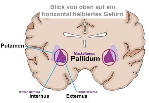 - Das Pallidum, als ein Bestandteil der Basalganglien, sendet dabei über seinen äußere Spitze aktivierende, mehr jedoch über seinen inneren Bereich hemmende elektrische Signale.