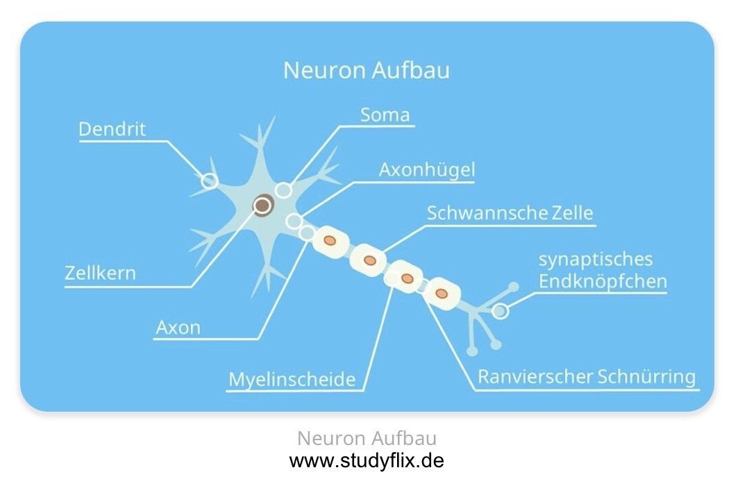 Die Grundbausteine der Nervenzellen sind ein Kern, Dendriten sowie Axone. Im Kern befinden sich u.a. Erbinformation und Energie. Die Dendriten sind Fühler zu benachbarten Neuronen. Axone sind Zellfortsätze, die Nervenzellen miteinander verbinden.