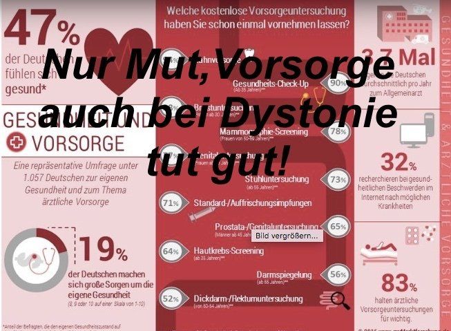 Dabei ist gerade für chronisch Erkrankte, so eben auch Dystoniebetroffene, Gesundheitvorsorge doppelt wichtig. Zum einen, um sich nicht unerkannt eine weitere Erkrankung "aufzusacken". Zum anderen, weil unerkannte Erkrankungen eine Ursache dafür sein können, dass dystone Symptome schlimmer zu Tage treten, als sie es eigentlich müssten bzw. täten. Also so oder so: Arglosigkeit und Angst sind schlechte Gesundheitsberaterinnen.